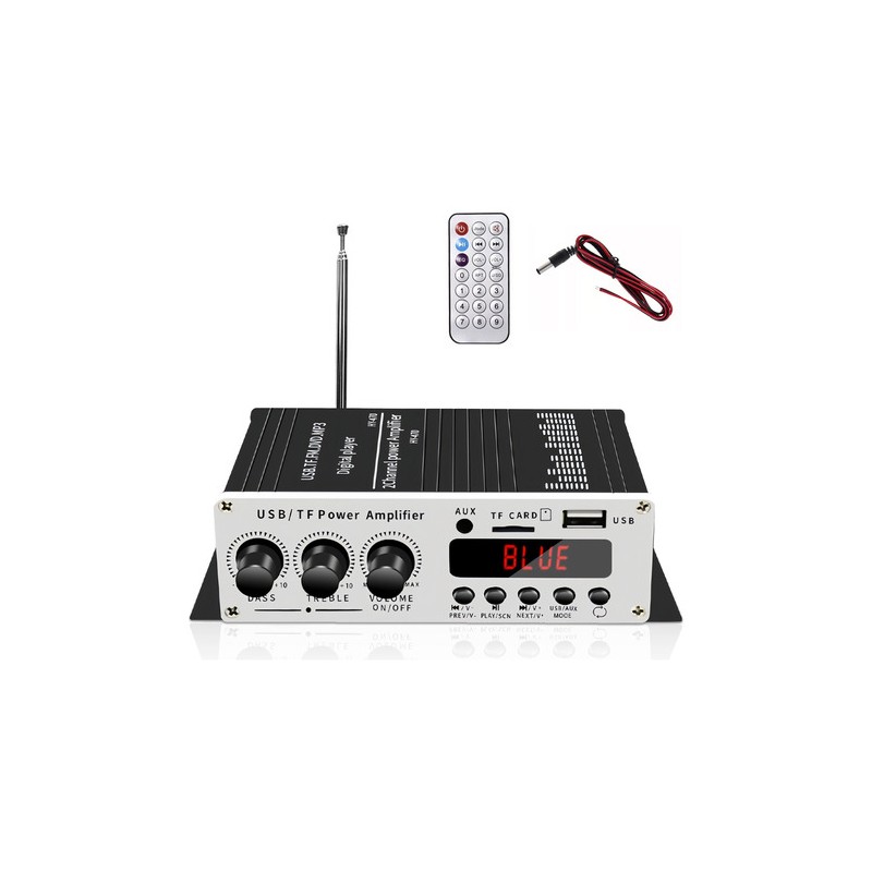 Control remoto Fuente de alimentación de entrada de voltaje V5.0: DC12-18V 3A Salida de sonido de 2.0 canales Potencia de salida: 20WX2 (R+L) Impedancia del altavoz: 4-8ohm Respuesta de frecuencia: 20-20 KHz THD mínimo: 0,4% relación señal-ruido : Entrada de 85 dB Sensibilidad: 270 mV Impedancia de entrada: 47 Kohm Parámetros de datos: